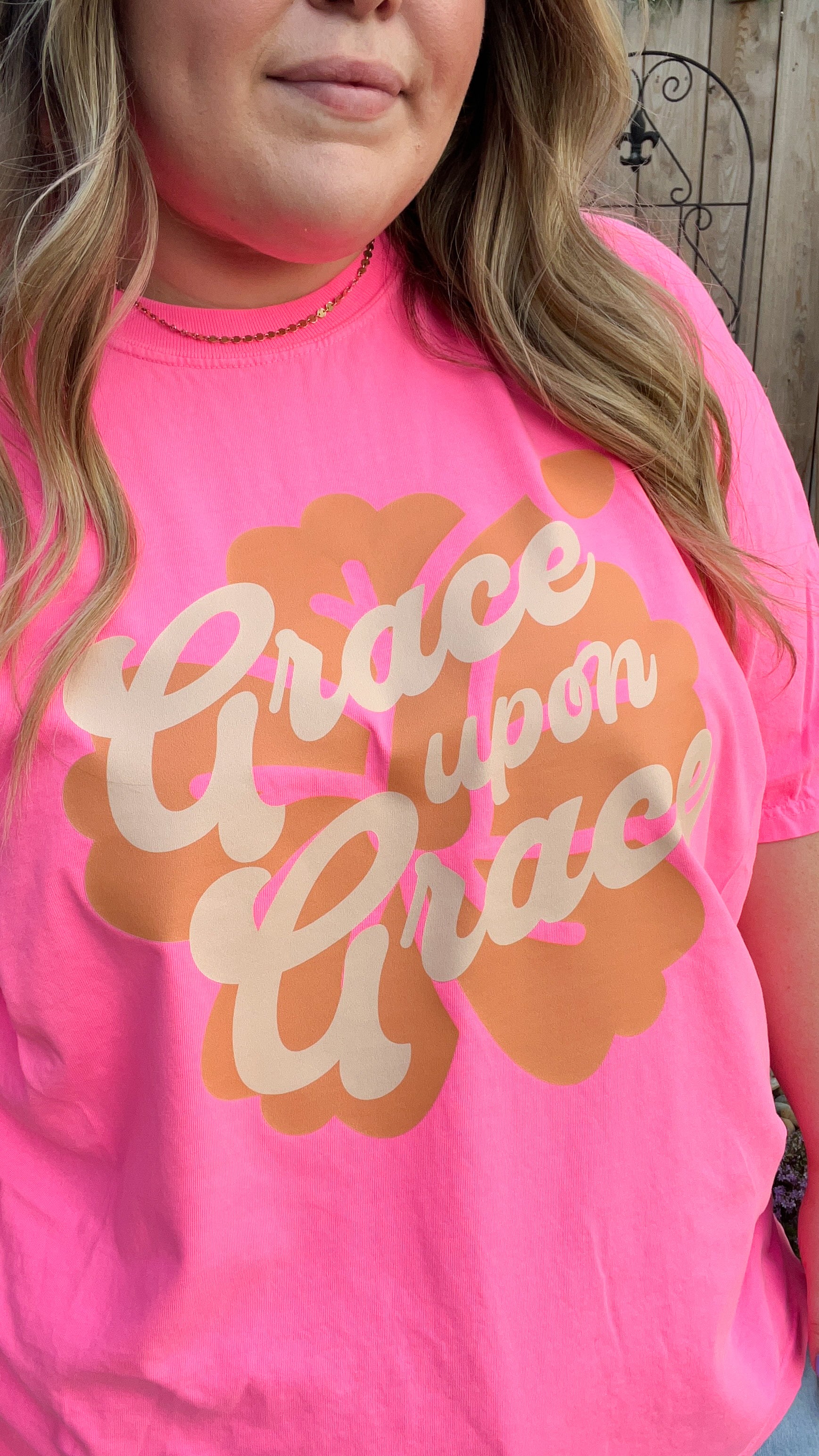 Grace Upon Grace is hand printed in CA on the perfect bright pink 100% cotton tee. True to size and pre shrunk.