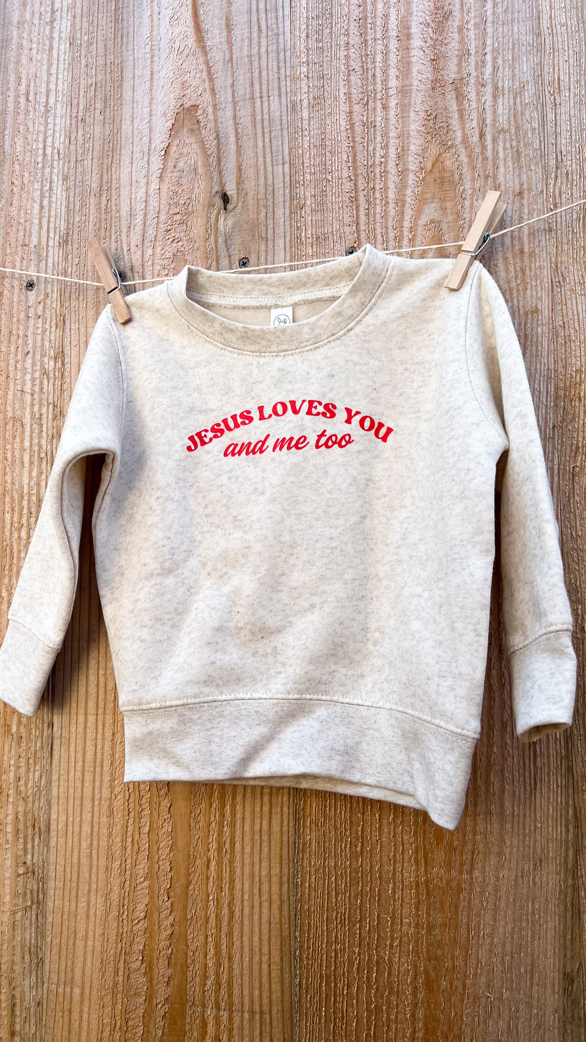 Our "Jesus Loves You and Me Too" toddler crewneck is printed on a Natural Heather 55/45 cotton/polyester sweatshirt.